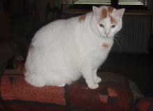 Zeko: Bijela ženska mačka sa narančastim mrljicama i repom.Sterilizirana.Ima oko 5,5 godina.Umiljata samo kada se njo